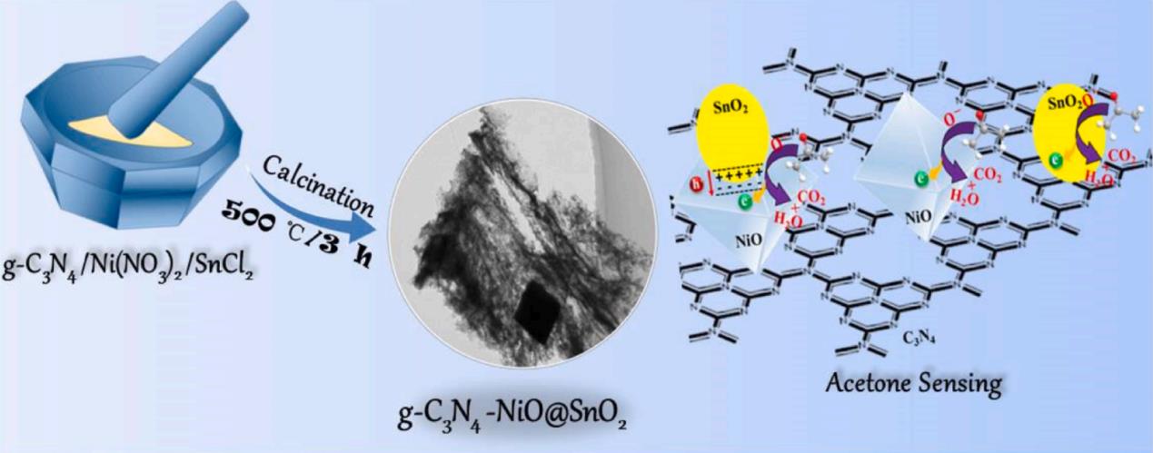 g-C3N4-氧化锡/氧化镍复合材料合成及丙酮传感示意图