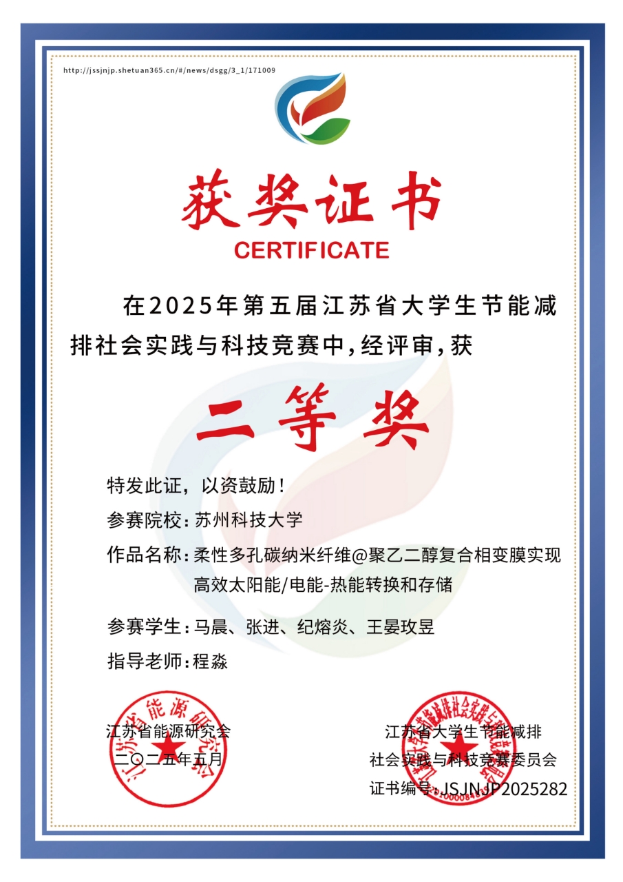 2025年5月25日,第五届江苏省大学生节能减排社会实践与科技竞赛决赛圆满落幕。在中心团队程淼老师的悉心指导下,由本科生马晨、张进、纪熔炎、王晏玫昱组成的创新团队凭借项目《柔性多孔碳纳米纤维@聚乙二醇复合相变膜实现高效太阳能/电能-热能转换和存储》,从全省53所高校的近2000支参赛队伍中脱颖而出,荣获二等奖。